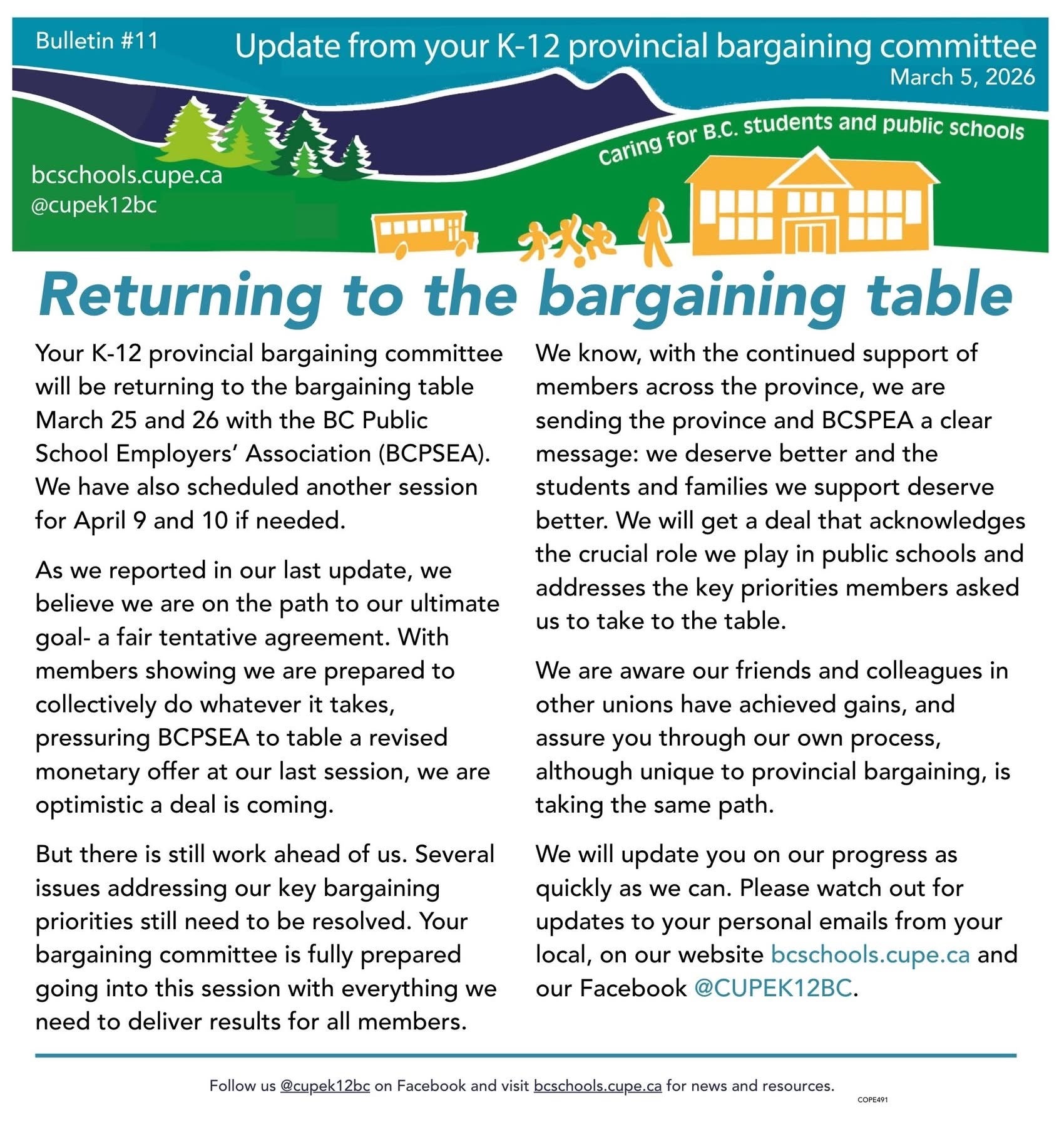 K-12 Bargaining update – March 5, 2026 March 29, 2026 by cupe947 Share this: Click to share on Facebook (Opens in new window) Facebook Click to share on X (Opens in new window) X